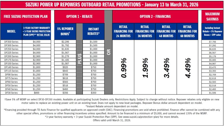 †Save 5% off MSRP on select DF30-DF350 models. Available at participating Suzuki Dealers only. Restrictions Apply. Subject to change without notice. Repower rebates only eligible on new motor sales to replace an existing power unit on an existing boat. Does not apply to new boat packages. Repower Bonus dollar amount dependent on model.